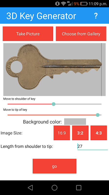 Это приложение позволяет создавать печатную ключ 3D от всего изображения. Просто сделайте снимок, внесите настройки, необходимые и нажмите кнопку Go. После того, как ключ закончена в может быть открыт с openscad и отправлен в 3D-принтер.