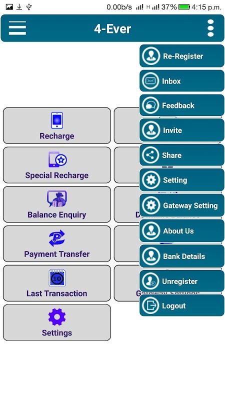 Balance check, Payment transfer, Transaction report, Search recharge by MobileNo/AccountNo