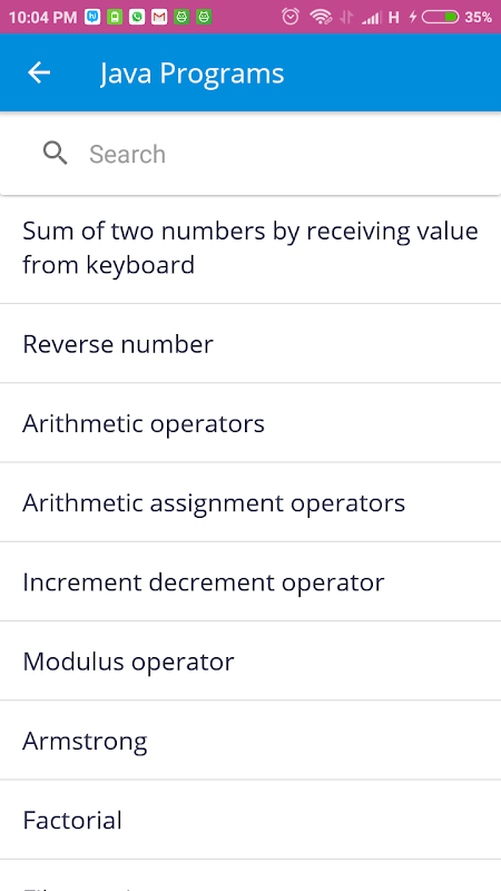 This Java Programs App will help you to learn JAVA programming language by simple example. This Java Programs App is very useful for all type of learners. We designed this Java Programs App in a plain simple way in order that it is easily understandable by everyone.