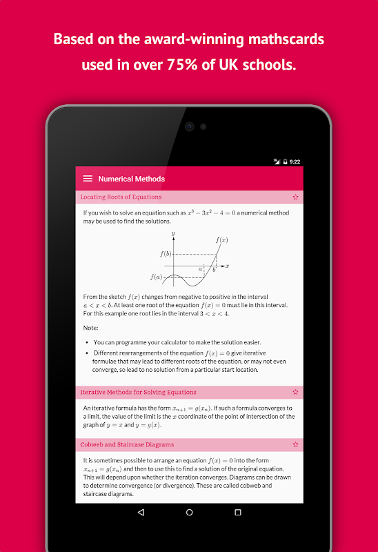 Разработано Университета Лафборо, бесплатно mathscard приложение содержит сотни примеров чистых математике формул и графиков / диаграмм. Разработанный специально для AS и математика-Level, mathscard приложение основано на очень успешной наградами mathscard раскладным формул листа и предназначен, чтобы помочь студентам с их изучения и математике экзамен пересмотра, когда у себя дома или в дороге.