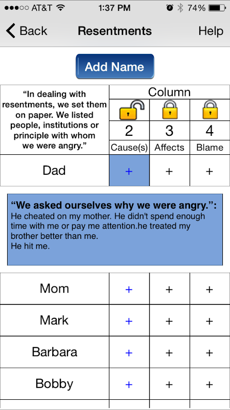 Приложение 4-го шага АА было создано участниками для участников как средство безопасного и удобного ввода информации об их инвентаре 4-го шага. По завершении вы можете распечатать свой инвентарь для использования на 5-м шаге.