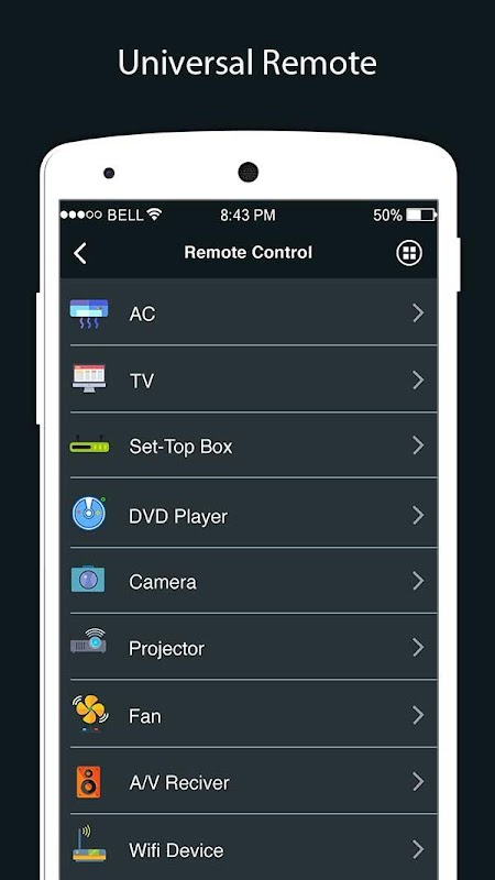 Всякий раз, когда вы не можете найти свой пульт, вам поможет универсальный пульт дистанционного управления. Пульт дистанционного управления - это бесплатный интеллектуальный пульт для вашего кондиционера. Вы также можете вызвать пульт ДУ как все в одном пульте. Он контролирует все устройства переменного тока всех данных компаний. Пульт дистанционного управления кондиционером регулирует температуру и управляет различными режимами кондиционера, такими как режим охлаждения, режим сушки, режим вентилятора, режим энергосбережения или энергосбережения, режим быстрого охлаждения и т. Д. В этом приложении доступны дополнительные функции, такие как телевизор, кондиционер , Приставка, камера, проектор, A / V-ресивер, DVD-плеер, вентилятор, WiFi-устройство и т. Д. Выберите категорию в соответствии с вашими требованиями. На следующем экране вас попросят выбрать компанию устройства, которым вы хотите управлять. Для вашего удобства в это приложение также добавлена функция поиска.