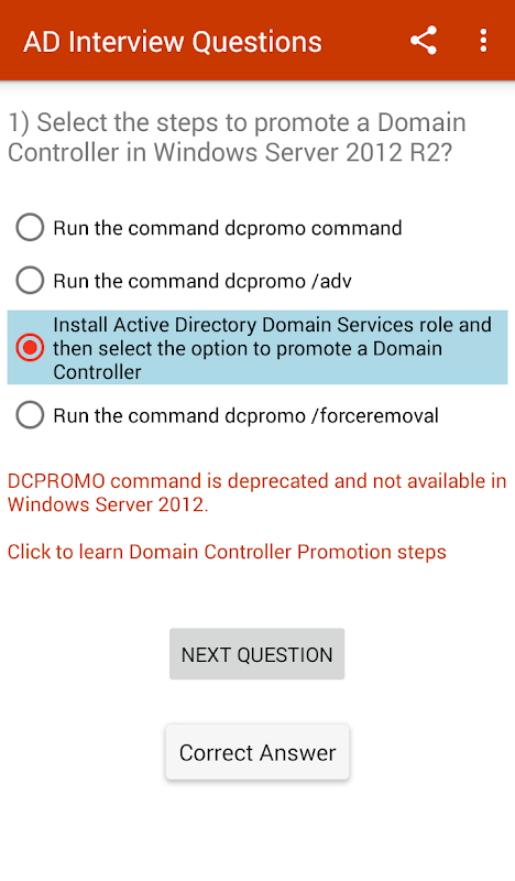 We have covered about 75 AD Interview Questions in this Android App but very soon we'll add some additional Windows Server 2012 and AD Interview Questions.