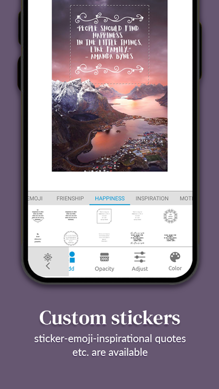 Установите текст на изображениях - добавьте стикер с текстовой цитатой на фотографии и сделайте свои изображения более привлекательными и прибыльными, прежде чем делиться ими в социальных сетях.
