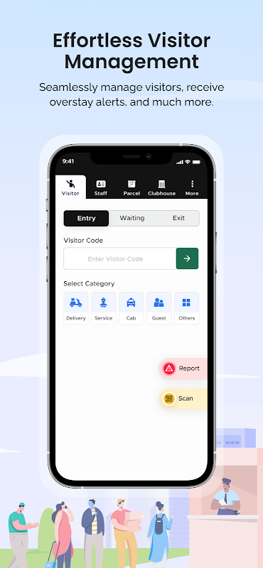 Он имеет функциональные возможности для каждого аспекта управления безопасностью в жилом сообществе - управление посетителями, управление домашним персоналом, посещаемость персонала ассоциации, управление парковкой, управление чрезвычайными ситуациями, управление входом-выходом материалов, управление доступом в клубный дом.