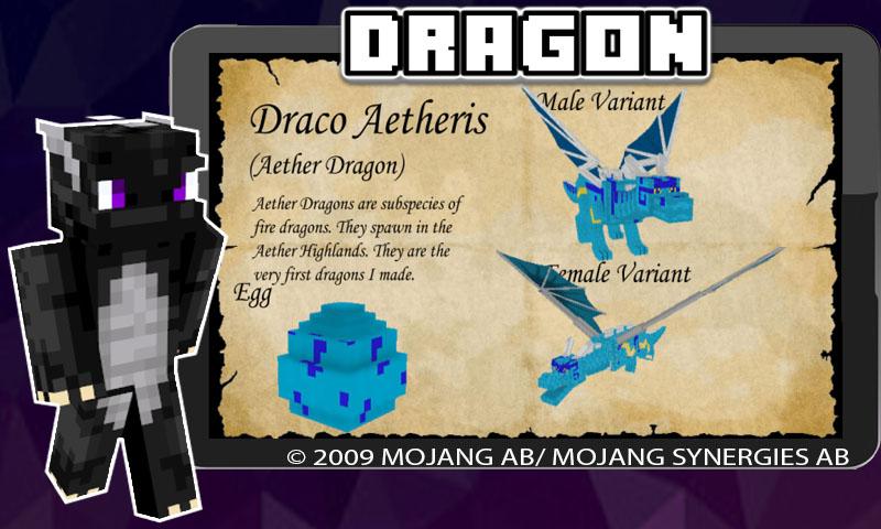Все драконы в Dragon Mounts, кроме призрачного дракона, имеют свои собственные доспехи, меч и чешую. Чтобы надеть броню, нажмите и удерживайте экран или щелкните правой кнопкой мыши. Вы также можете надеть на драконов седло, сундук и конскую броню. У всех драконов есть враждебная версия, которую можно приручить. Прирученные версии не летают. Все драконы сбрасывают чешую.