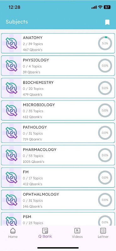 Основные функции включают ежедневные вопросы, курсы с целевыми обучающими видеороликами, QBank, ToDo, сеансы в реальном времени.