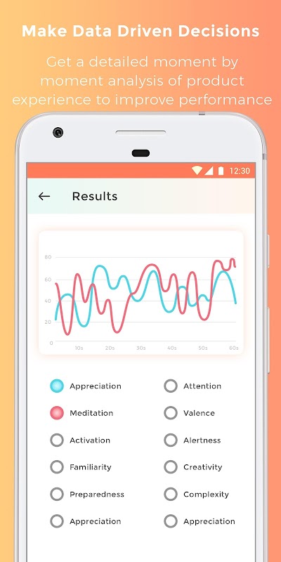 Получить такие показатели, как внимание, признательность, концентрации потребителей, счастье, скука фамильярность оценки среди других. Мониторинг данных в режиме реального времени. Получите момент за моментом анализа всего опыта продукта (в случае варианта, упаковки или UI / UX тестирования) или потребления контента (в случае тестирования видео, объявления, статьи и т.д.).