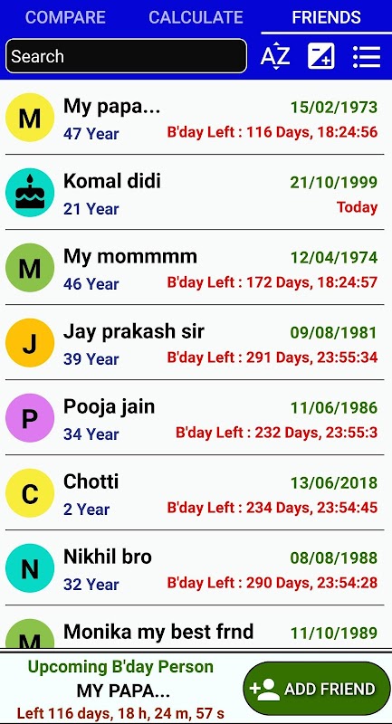 Никогда больше не забывайте о дне рождения! Калькулятор возраста и книга дней рождения — идеальный инструмент для легкого расчета вашего возраста и отслеживания всех важных дней рождения. Быстро узнайте, сколько вам лет в годах, месяцах и даже днях! и в какой день недели ты родился! Вы также можете сравнить свой возраст с предполагаемым возрастом, друзьями или членами семьи. Кроме того, создайте список дней рождения, годовщин и дат помолвки своих друзей, родственников и коллег, чтобы получать своевременные напоминания и гарантировать, что вы никогда не упустите шанс отпраздновать это событие с близкими. Доступно на хинди и английском языках. Загрузите «Калькулятор возраста и книгу на день рождения» сегодня и упростите свою жизнь!