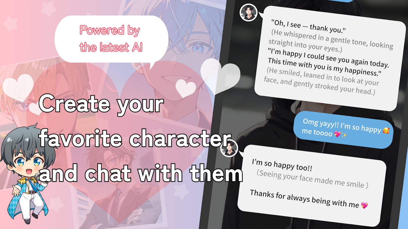 Будь то персонажи из аниме, манги или игр — или оригинальные персонажи, придуманные вами — вы можете задать характер, тон, мировоззрение и даже отношения между вами и персонажем. Результат — естественная, глубокая и эмоционально резонансная беседа, которая ощущается живой.