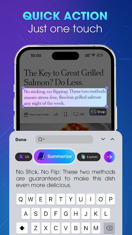 Быстрое действие — всего одно касание: выполняйте распознавание скриншотов в любом месте, а затем вызывайте искусственный интеллект для быстрого выполнения важных задач, таких как объяснение проблем, переписывание контента, ответ на электронные письма или перевод на разные языки.