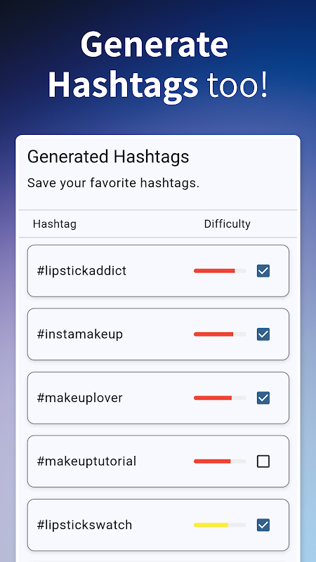 ✓ Создание хэштегов с помощью ИИ. Опишите свой пост, и наш ИИ сгенерирует хэштеги с метаданными сложности, чтобы вы могли легко выбрать для себя лучшие из них.