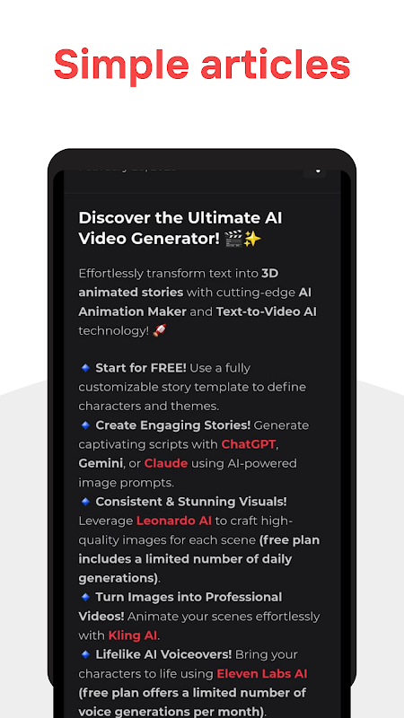 Одной из величайших особенностей AI Elevate является разнообразие доступного контента. Приложение позволяет вам научиться создавать мультфильмы с использованием передовых методов искусственного интеллекта, открывая широкий спектр творческих способностей и инноваций. Вы также узнаете, как создавать фильмы с помощью инструментов искусственного интеллекта, предлагающих высококачественные визуальные и звуковые эффекты. Кроме того, приложение предлагает подробные руководства по написанию историй с использованием искусственного интеллекта, что позволяет вам создавать интересный художественный контент, который понравится вашей аудитории.