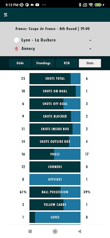 • Подробная информация о матче - статистика, H2H, турнирная таблица, форма команды, коэффициенты
