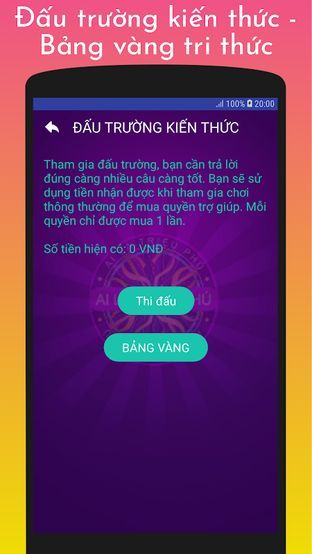 Tham gia đấu trường kiến thức để thể hiện sự hiểu biết của bạn cùng mọi người trên khắp Việt Nam. Bạn sẽ được vinh danh khi nằm trong top những người đứng đầu hàng quý.