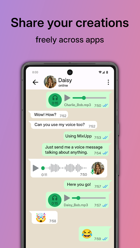 🎵 Запись и импорт аудио: Используйте встроенный микрофон телефона для записи звука, импортируйте аудиофайлы прямо с вашего устройства или поделитесь любимым голосовым сообщением с MixUpp – Voice Clone Anyone и дайте волю своему творчеству!