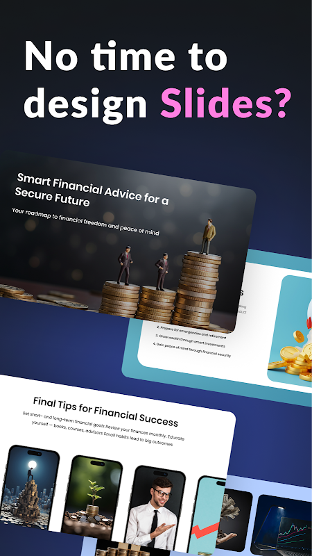 Нет навыков дизайна? Не проблема. Наше приложение выполнит работу профессионального дизайнера, создателя диаграмм и эксперта по PPT