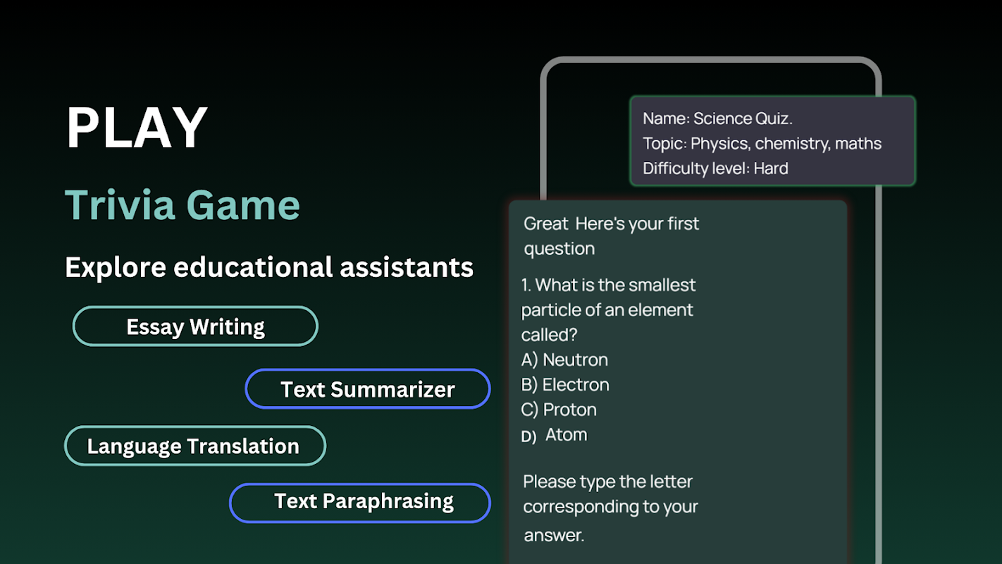 Если вы ищете знания, творчество, овладение языком или личностный рост, AI Chat — ваше универсальное решение. Он выходит за рамки традиционного чата A I, предлагая ворота в мир возможностей (помощник AI).