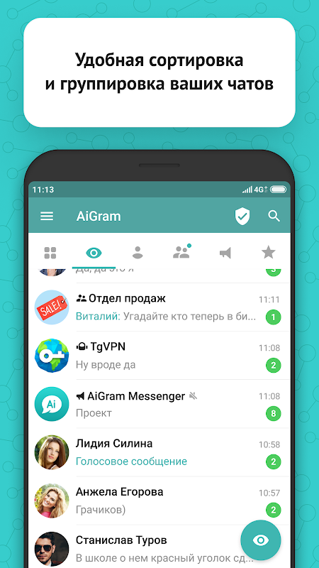 - Автоматическая сортировка групповых чатов, каналов, чат- ботов и т.д.;