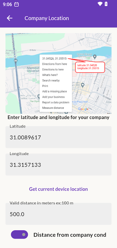 -Добавьте местоположение компании и возможность включать или отключать условие расстояния от местоположения сотрудника до местоположения компании.