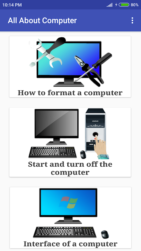 Все о компьютерном приложении поможет вам увеличить ваши знания компьютера. С помощью этого приложения вы сможете узнать, как пользоваться компьютером. Это приложение включает в себя основную информацию о компьютерных операциях. Кроме того, в этом приложении различные компьютерные части информации, связанной включен.