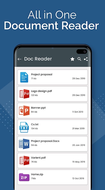 Время для офисной работы или учебы легко и доступно в одном месте. Эта программа для чтения документов упростит вашу жизнь, поскольку поможет вам читать все документы в телефоне. Если вы куда-то путешествуете, это приложение для управления документами будет очень полезно для управления документами в одном месте. Программа чтения документов позволяет вам читать все типы файлов и вспомогательные файлы, такие как ppt (Powerpoint), Excel Sheet, Word file, xlxx, Pdf и другие форматы файлов. Для чтения документов необязательно иметь с собой ноутбук, просто откройте свой мобильный телефон и начните читать и редактировать все документы. Просто загрузите все приложения для чтения и просмотра документов и получите мгновенный доступ к любому документу. All Document Reader - это быстрый и быстрый инструмент для чтения документов, который мгновенно просматривает документы.