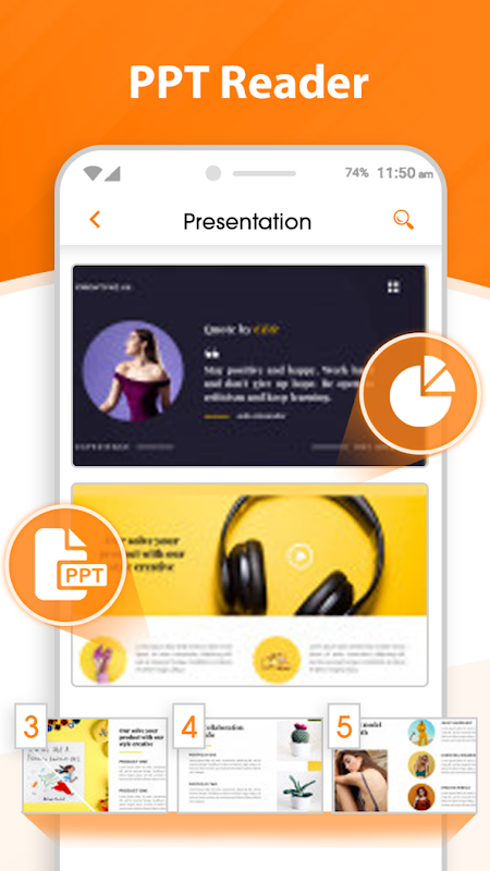 - Поддержка чтения всех файлов документов: презентаций Ppt, pptx, pps, ppsx, презентаций и т. д.
