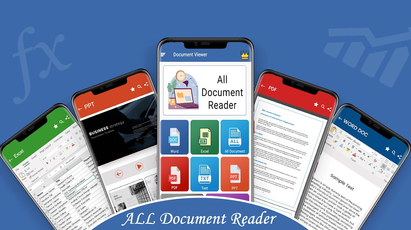 All Document Reader & Viewer - это приложение для умного офиса, которое помогает пользователю читать все документы с телефона или из Интернета, поддерживает чтение файлов Doc, xls, PDF, xlsx, docx, PDF Reader, файлов ppt, txt и pptx быстро, плавно и без труда. Приложение All Document Reader: Excel, PDF, Word, PowerPoint, Documents предлагает отличные возможности для легкого чтения нескольких документов. Все программы для чтения документов поддерживают PDF Reader, Xls, docs, ppt reader, xlsx и docx Reader, txt, excel и другие программы для чтения и просмотра документов.