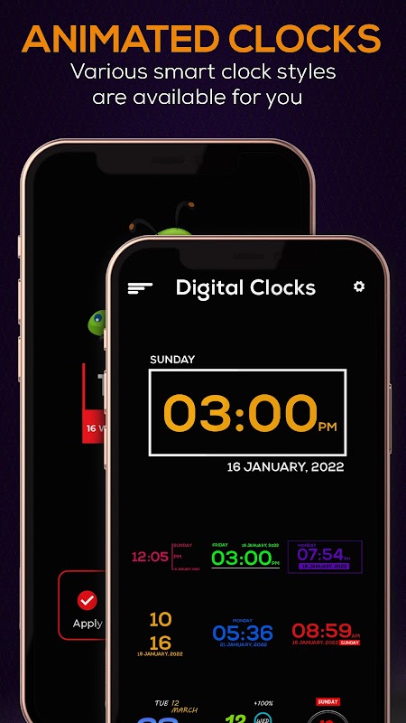 Различные жанры часов, такие как аналоговый дисплей часов, цифровые часы, светодиодный циферблат, постоянно отображаемые смарт-часы, фоточасы, часы с эмодзи и живые обои с часами.