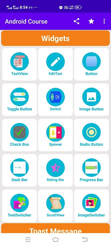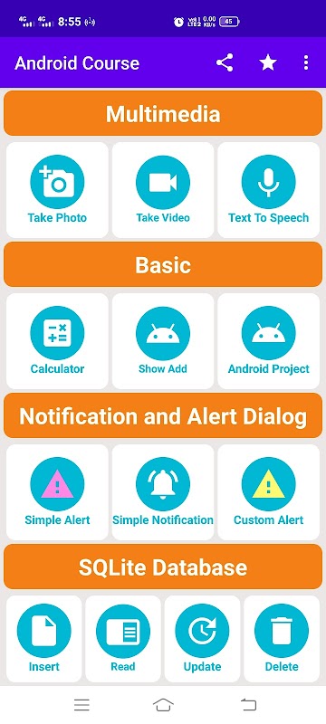 Эти функции являются препятствием в этом приложении для всех разработчиков Android, которые легко освоить. Пользователь может использовать это учебное приложение по курсу Android в автономном режиме и онлайн.