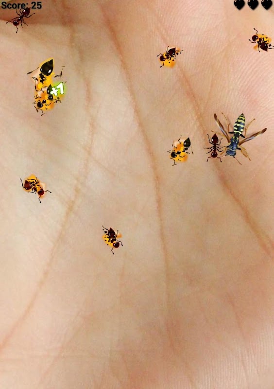 * Regular ants - of various colours and species. They die after one hit. Tap them with your finger before the reach the bottom of the screen. You will get additional risk bonus for regular ant: 1, 2 or 3 points, depending on how close to bottom of the screen the ant is.