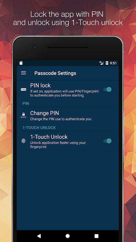 • Prevent access to the application settings by enabling PIN. unlock or 1-Touch unlock.