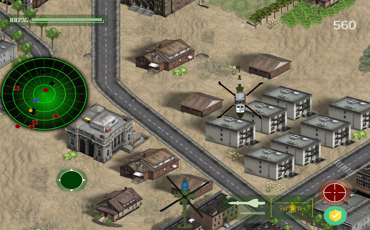 - Магазин с возможностью выбора вертолета, вооружения, типа защиты и выбора группы Поддержки из множества представленных в игре(в разработке).