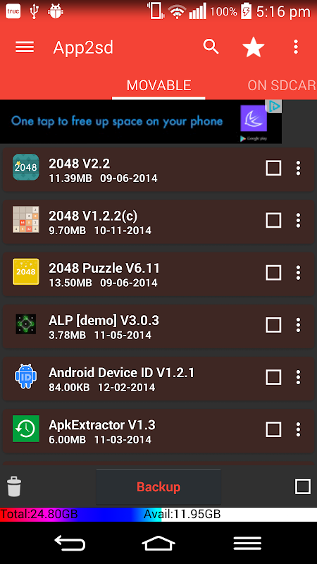 This app is not used to backup apps to SD card. It only helps you to move a portion of apps used space to SD card.