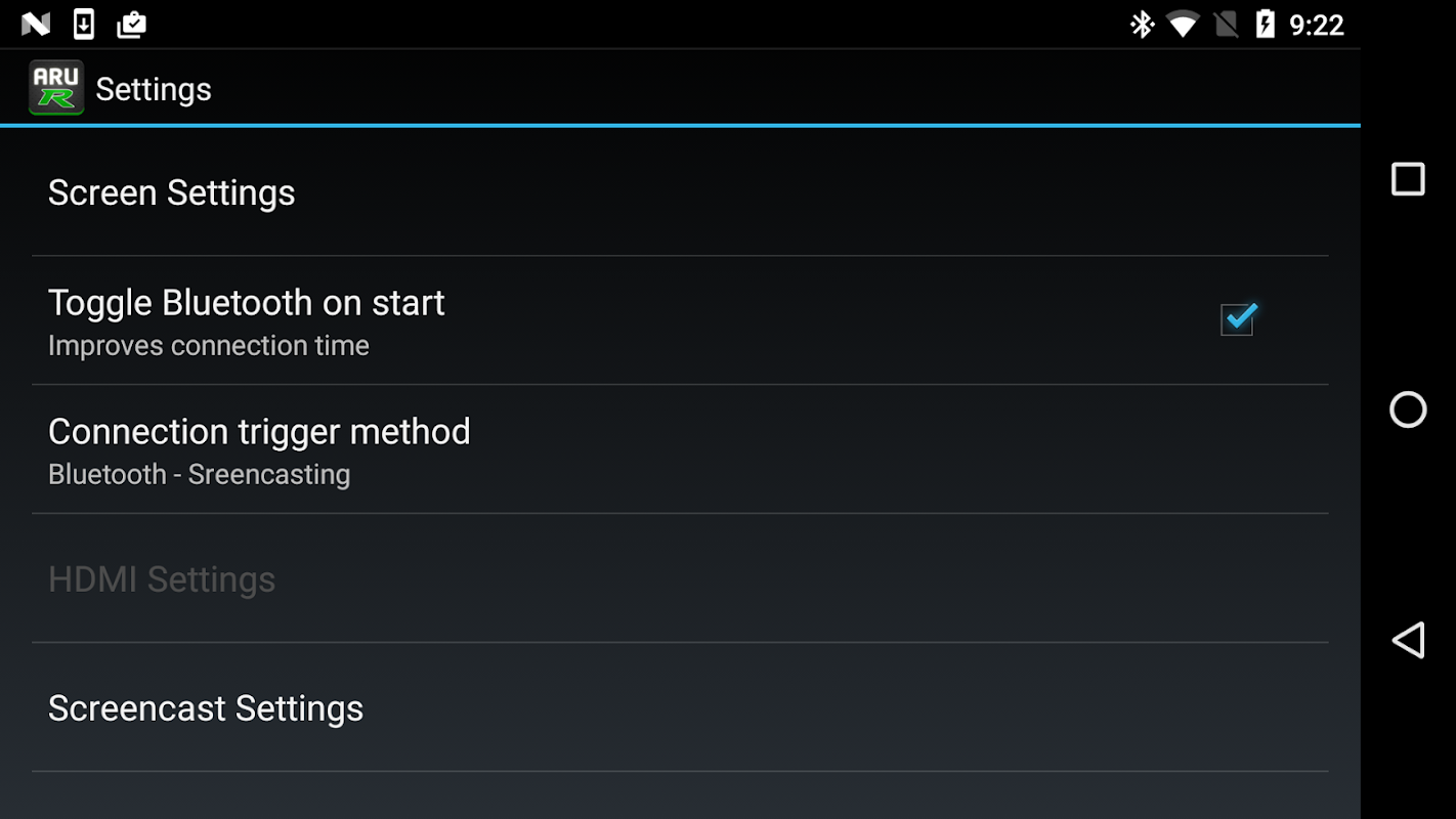 Режим AppRadio требует, чтобы ваше устройство было подключено к входу HDMI головного устройства. В зависимости от устройства это можно сделать с помощью адаптера MHL/Slimport/Miracast/Chromecast. Это приложение поддерживает автоматическое подключение к беспроводным устройствам для трансляции экрана. Поскольку Google API не поддерживает это напрямую, это делается через графический интерфейс телефона. Обратите внимание, что можно использовать только встроенные в телефон возможности создания скринкастов.