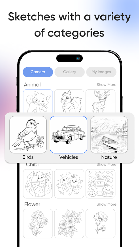 Приложение AR Draw Sketch: Trace & Sketch поддерживает как фотографии из мобильной галереи, так и мобильные камеры, поэтому вы можете легко превратить любой сценарий в живой эскиз, как профессиональный художник. С помощью этого приложения AR Draw Sketch: Trace & Sketch вы также можете найти новейшую коллекцию шаблонов, которые можно рисовать как профессиональный художник. Сохраняйте любые сценарии создания живых эскизов в фотогалерее приложения. Воспользуйтесь коллекцией различных шаблонов, таких как эстетические, животные, аниме, автомобили, милые, детские, уроки рисования и многие другие. Получите простой способ научиться идеальному рисованию эскизов для начинающих с помощью этого приложения AR Draw Sketch: Trace & Sketch.