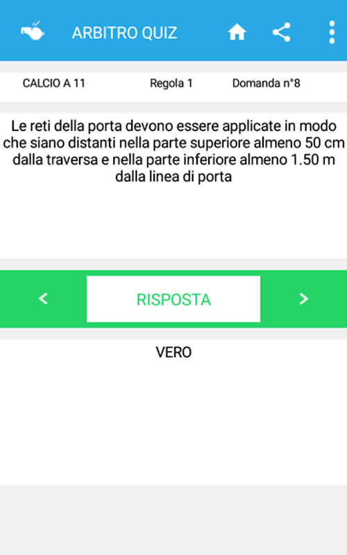 Le domande sono divise per Regolamento e per Regola e mostrano la risposta corretta soltanto alla pressione del tasto "RISPOSTA". Questa funzionalità permettere all'utente di pensare la risposta senza leggerla, in modo da esercitarsi per superare i quiz tecnici a cui sono sottoposti periodicamente gli Arbitri e testare la propria conoscenza regolamentare.