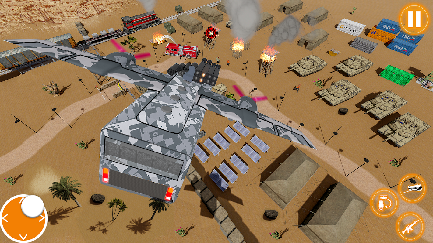 Любители игр о роботизированном транспорте очень захотят пострелять в сказочном городе с ультрасовременным полетом, таким как полет на квадрокоптере. Игра «Армейский пассажирский автобус» на самом деле доставляет вам такие развлечения, как полеты на самолетах, летательные аппараты-роботы, летающие роботы-загары и любые оставшиеся летные испытательные системы. Управление армейским транспортом, безусловно, непростая работа, но когда у вас есть необыкновенная сила роботизированного транспорта, меняйте мощь. Вы можете летать и стрелять с помощью своих способностей героя. Сыграйте в эту захватывающую игру за рулем и превратитесь в состязание по стрельбе из роботов.