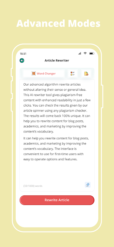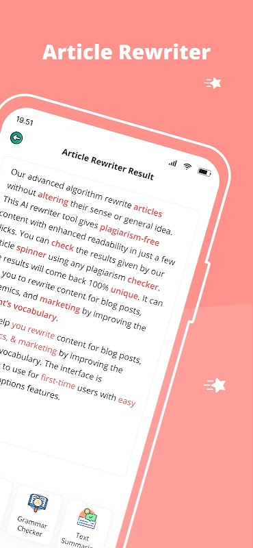 Это цифровое приложение, которое переписывает статьи, эссе и подчеркивает концепцию замены терминов синонимами, используя активные залога вместо пассивных залогов и напрямую реагируя на косвенную речь, используя различные методы, доступные в приложении, чтобы повысить свежесть и эксклюзивность существующего контента.