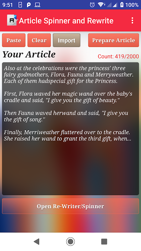 Это расширенный редактор статей и счетчик, который превращает ваш существующий контент в уникальный контент. Лучший инструмент для прядения статей и перезаписи, и впервые в магазине Google Play вы не найдете такого гладкого и быстрого инструмента, который может переписать вашу статью без изменения смысла вашей статьи.