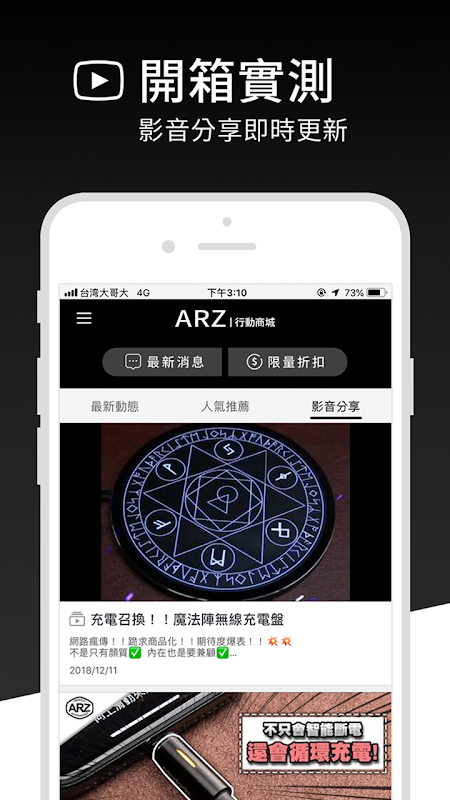 想掌握最新、最優惠的手機配件,快下載ARZ行動商城APP,旗下眾多品牌:犀牛盾、SGP、倍思..等等;更有多款系列商品,自拍/影音/行動,讓你想不到手機,原來有那麼多種玩法。