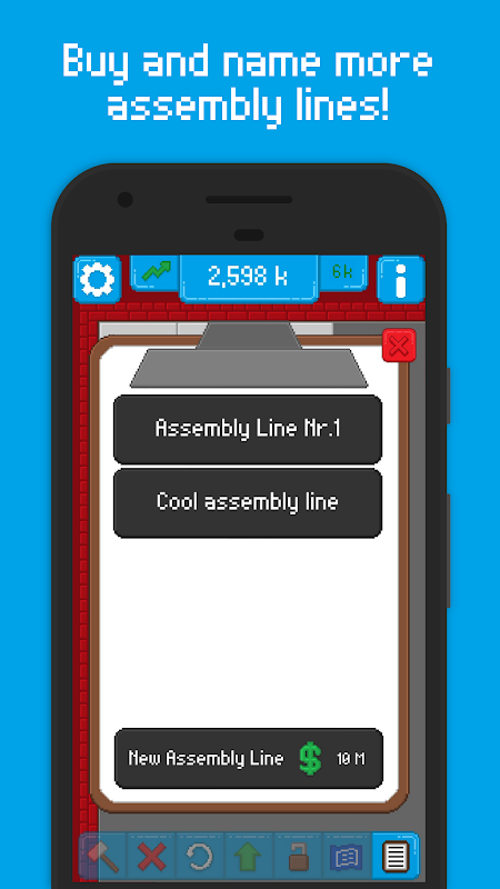 Assembly Line сочетает в себе элементы игр-кликеров и тайкунов. Вам нужно построить лучшую сборочную линию, чтобы получить максимальную прибыль. Существуют различные типы машин, которые помогут вам в этом, но вы должны использовать их стратегически.
