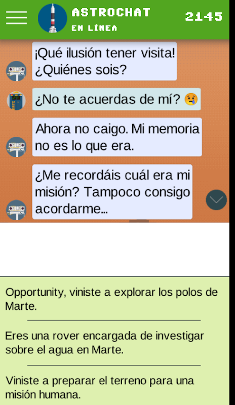 Хотите узнать о Вселенной из рук популяризатора астрономии и несколько необычного робота? Запустите Astrochat и приготовьтесь путешествовать по самым экзотическим местам Вселенной. От Нила Сагана Тайсона, Ады Рубин и R.A.T.S (технологически саркастический астрофизический робот) приготовьтесь узнать о черных дырах, взрывах сверхновых и загадочных астрочастицах. Выберите свое собственное космическое приключение и преодолевайте трудности, пока не завершите миссии ... если вы переживете юмор R.A.T.S.