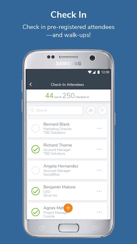 - Capture: Scan business cards and badges, check in pre-registered attendees, or add manually.