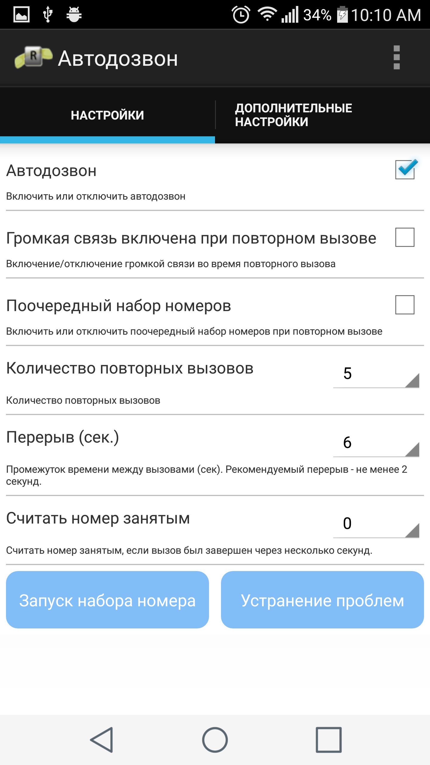 • Настройка времени между повторными вызовами.