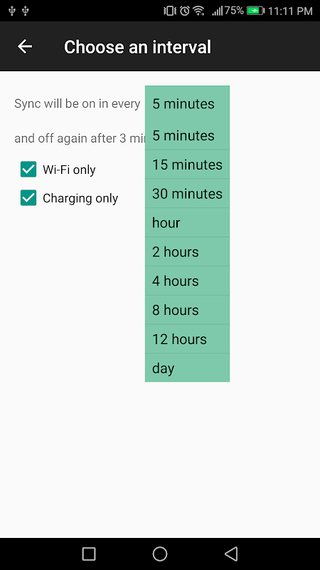 Включите синхронизацию только при зарядке, подключении к Wi-Fi, через определенный интервал или просто вручную.