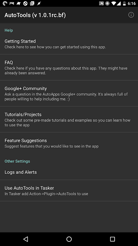 ВНИМАНИЕ: Вы должны иметь TASKER СМОНТИРОВАН это приложение для любого использования: Autotools может использоваться только в качестве плагина в Tasker. Пожалуйста, не оценить его негативно из-за этого.