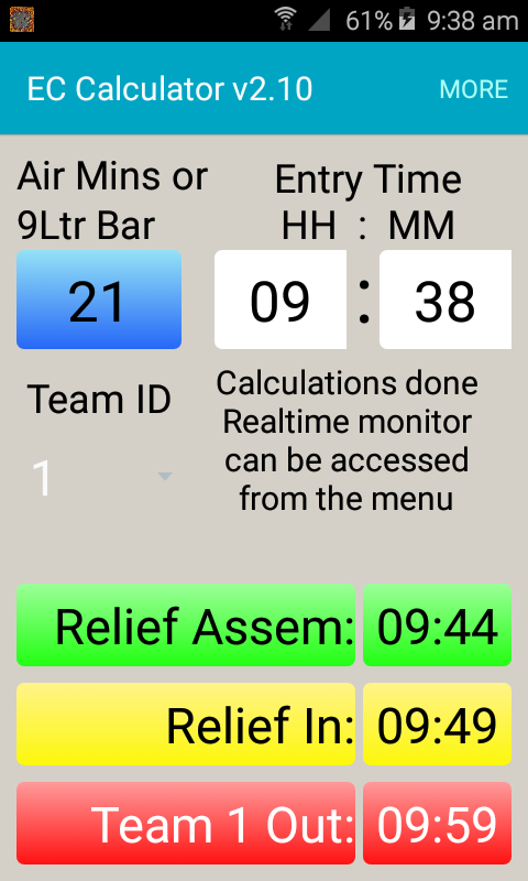 5. Tap the CALCULATE button - This timer is now running. The Air Mins field will change colour and sound an alarm when reaching each of the 15,10 and 1 minute markers. Each active timer can be displayed by changing the Team selection.