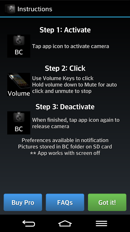 Background Camera is the ONLY camera app in the market that takes pictures in the background so you can use your phone as normal. You can even turn your phone screen off and click pictures! NO ONE can tell you are clicking pictures.