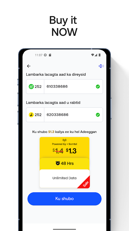 Badal Data предлагает простой способ получить сим-данные от Somtel, Somnet и Hormuud. С помощью этого приложения вы можете быстро просмотреть доступные пакеты данных.